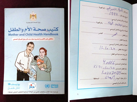 ガザなど自治区では2008年以降、国際協力機構(JICA)が作製に協力したアラビア語版の母子手帳の運用が始まった。識字率の低さを考慮し、イラストを多く使ったのが特徴だ。