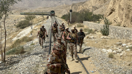 〔写真説明〕15日、パキスタン南西部バルチスタン州シビで、列車乗っ取り事件の現場を調べる治安部隊(EPA時事)
