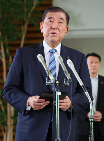 〔写真説明〕トランプ米大統領との電話会談を終え、取材に応じる石破茂首相=23日、首相官邸