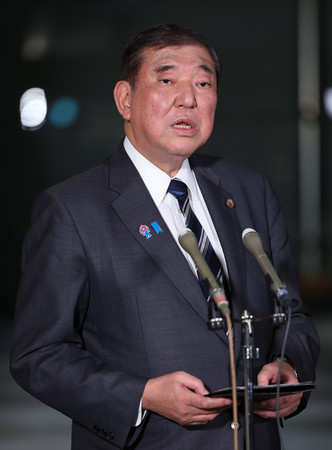 〔写真説明〕トランプ米大統領との電話会談を終え、取材に応じる石破茂首相=29日午後、首相官邸