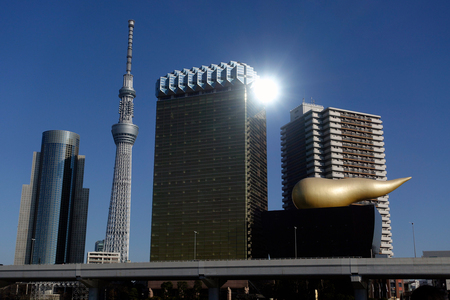 〔写真説明〕アサヒグループ本社(中央)=東京都墨田区(EPA時事)