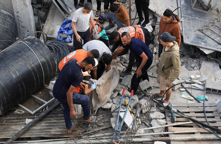 〔写真説明〕29日、パレスチナ自治区ガザの中心都市ガザ市で、イスラエル軍の攻撃を受けた住宅のがれきの下から遺体を収容する市民ら(ロイター時事)