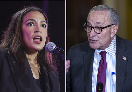 〔写真説明〕米民主党のオカシオコルテス下院議員(左)とシューマー上院院内総務(EPA時事)