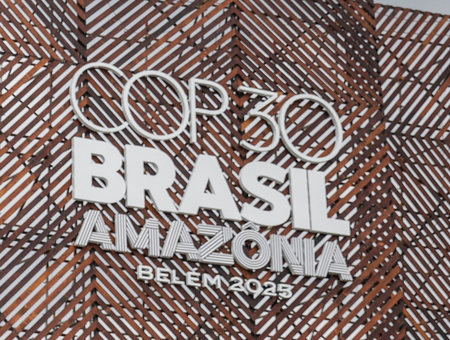 〔写真説明〕国連気候変動枠組み条約第30回締約国会議(COP30)のロゴマーク=13日、ブラジル・ベレン(EPA時事)