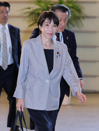 〔写真説明〕首相官邸に入る高市早苗首相=5日午前、東京・永田町