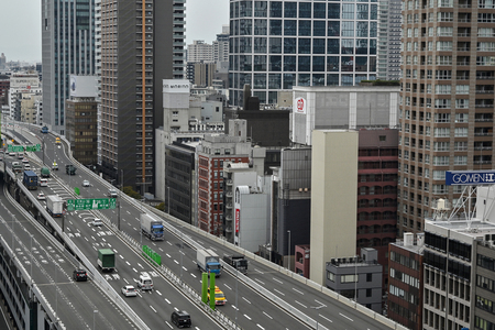 〔写真説明〕大阪中心部のビル群の脇を通る高速道路=4月10日(AFP時事)