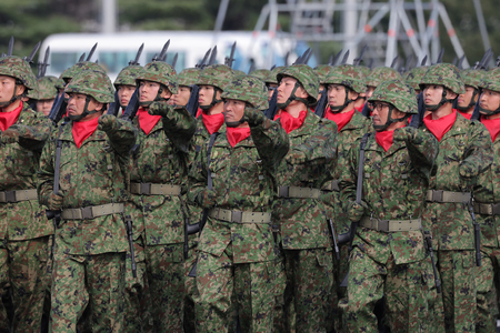 〔写真説明〕自衛隊観閲式で行進する陸上自衛隊の隊員=2024年11月、陸上自衛隊朝霞訓練場