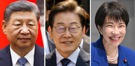 〔写真説明〕(左から)中国の習近平国家主席、韓国の李在明大統領、高市早苗首相(AFP時事)