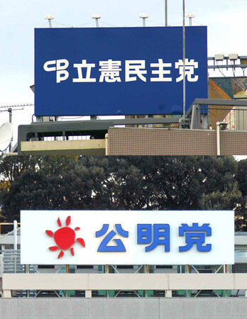 〔写真説明〕立憲民主党(写真上)と公明党の看板