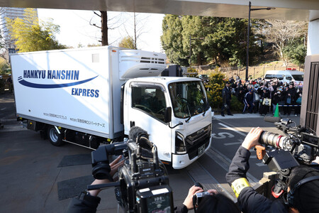 〔写真説明〕ジャイアントパンダのシャオシャオとレイレイを乗せ、上野動物園を出発するトラック=27日午後、東京都台東区