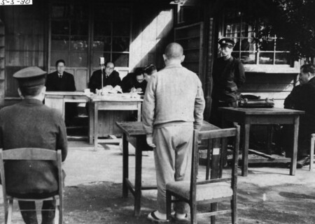 〔写真説明〕1950年ごろに撮影されたとされるハンセン病療養所「菊池恵楓園」内に設置された特別法廷(菊池事件とは無関係の別事件)(国立療養所菊池恵楓園歴史資料館提供)