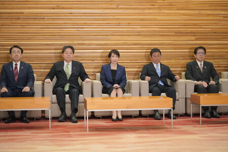 〔写真説明〕臨時閣議に臨む高市早苗首相(中央)=18日午前、首相官邸