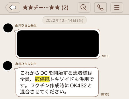 〔写真説明〕改善命令を受けた銀座鳳凰クリニック院長が薬の混合を指示するLINE。「DC」は樹状細胞の投与、「OK432」は医薬品ピシバニールを指す(一部加工しています)(同院関係者提供)