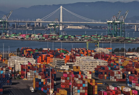 〔写真説明〕米オークランド港に積み上げられた輸送コンテナ=1月、西部カリフォルニア州(AFP時事)