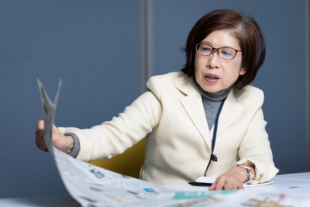 〔写真説明〕新聞を手にインタビューに応じる日本女性記者協会の秋山理砂代表理事=2月12日、横浜市