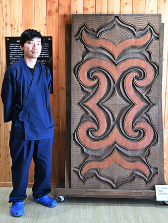 〔写真説明〕自作の木彫りの横に立つ「阿寒アイヌクラフトセンター・ハリキキ」研修生の大和田秋之助さん=1月22日、北海道釧路市