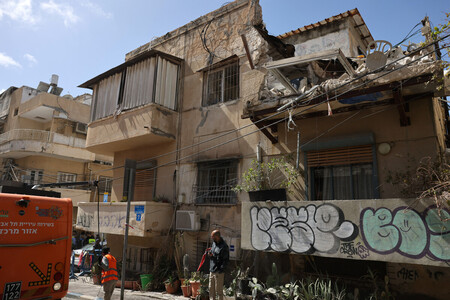 〔写真説明〕22日、イランによるミサイル攻撃を受けたイスラエル中部テルアビブで、一部損壊した家屋(AFP時事)