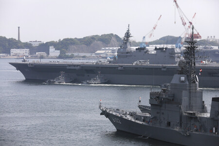 〔写真説明〕米艦防護へ横須賀基地を出港する海上自衛隊のヘリコプター搭載型護衛艦「いずも」(奥)=2017年5月、神奈川県横須賀市