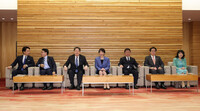 〔写真説明〕閣議に臨む松野博一官房長官(中央)ら=1日午前、首相官邸