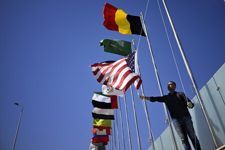 〔写真説明〕11日、エジプト東部シャルムエルシェイクで、パレスチナ自治区ガザの和平を巡る国際会議を控え、掲揚される各国の国旗(AFP時事)