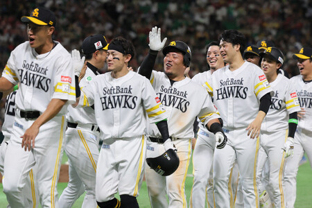 〔写真説明〕日本ハムに勝利し、喜ぶ山川(左から4人目)らソフトバンクナイン=15日、みずほPayPay
