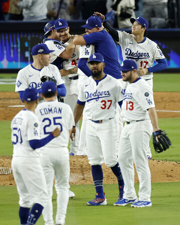 【ロサンゼルス時事】米大リーグのプレーオフは17日、ロサンゼルスでナ・リーグ優勝決定シリーズ(7回戦制)第4戦が行われ、大谷翔平らが所属するドジャースがブルワーズを5―1で下して4連勝とし、2年連続のリーグ優勝とワールドシリーズ(WS)進出を決めた。