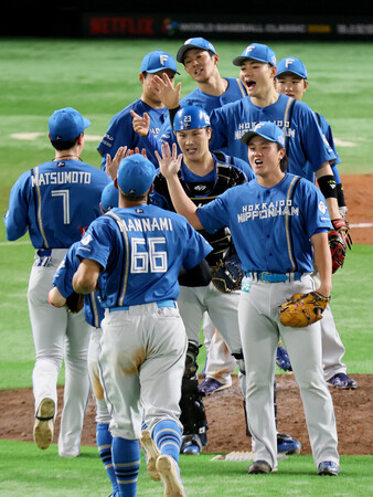 プロ野球のクライマックスシリーズ(CS)ファイナルステージ(6試合制)は18日、みずほペイペイドーム福岡でパ・リーグの第4戦が行われ、リーグ2位の日本ハムがソフトバンクを9―3で破り、2勝目を挙げた。ソフトバンクはリーグ優勝のアドバンテージを合わせて3勝2敗となった。 日本ハムはレイエスの2本塁打など14安打を重ね、打ち勝った。【時事通信社】 〔写真説明〕ソフトバンクに勝ち、喜ぶ日本ハムナイン=18日、みずほPayPay