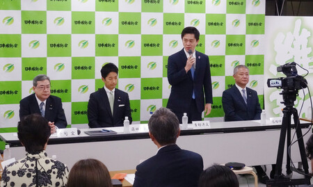 〔写真説明〕日本維新の会の常任役員会。中央右は吉村洋文代表=19日午後、大阪市