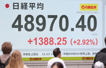 週明け20日の東京株式市場は、自民党と日本維新の会による連立政権発足に向けた協議の進展が好感され、全面高の展開となった。前週末の米国株高の流れも引き継ぎ、日経平均株価は大幅反発し、9日に付けた取引時間中の最高値(4万8597円08銭)を更新した。20日午前の終値は前週末比1388円25銭高の4万8970円40銭。午後に入り、初の4万9000円台を付けた。