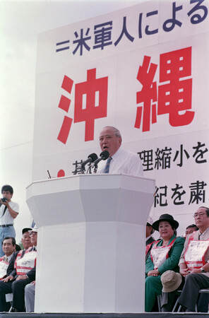 〔写真説明〕米兵の少女暴行事件に抗議する「沖縄県民総決起大会」であいさつする大田昌秀沖縄県知事(肩書は当時)=1995年10月21日、沖縄県宜野湾市