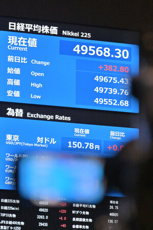 21日午前の東京株式市場は、自民党と日本維新の会による連立政権樹立合意や米株高などが好感されて買いが先行した。日経平均株価の上げ幅は前日比700円を超え、5万円に迫った。積極的な財政支出を掲げる高市早苗自民党総裁の首相選出を期待した「高市トレード」が継続し、取引時間中の最高値を連日で更新した。午前の終値は744円31銭高の4万9929円81銭。