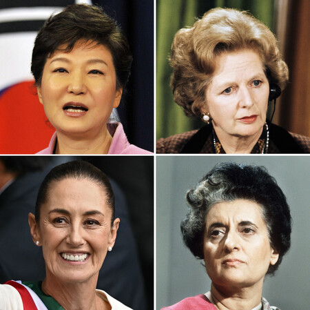 〔写真説明〕(写真左上から時計回りに)韓国の朴槿恵元大統領、英国のサッチャー元首相、インドのインディラ・ガンジー元首相、メキシコのシェインバウム大統領(AFP時事)