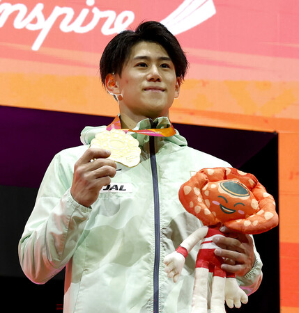 【ジャカルタ時事】体操の世界選手権第4日は22日、ジャカルタで男子個人総合決勝が行われ、橋本大輝(日本生命・セントラルスポーツ)が6種目合計85.131点をマークし、3連覇を果たした。2015年大会まで6連覇した内村航平以来、史上2人目の偉業。パリ五輪3冠の岡慎之助(徳洲会)は合計81.797点で5位だった。【時事通信社】 〔写真説明〕男子個人総合で3連覇し、金メダルを掲げる橋本大輝=22日、ジャカルタ(EPA時事)