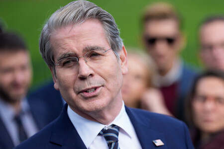 〔写真説明〕ホワイトハウスの庭で記者団の質問に答えるベセント米財務長官=22日、ワシントン(EPA時事)