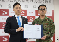 〔写真説明〕クマ被害防止のための協定を締結した秋田県の鈴木健太知事(左)と陸上自衛隊第9師団長の松永康則陸将=5日午前、秋田県庁