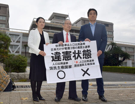 〔写真説明〕7月参院選の「1票の格差」を巡る広島高裁の判決後、「違憲状態」などと書かれた紙を掲げる升永英俊弁護士(中央)ら=25日午後、広島市中区