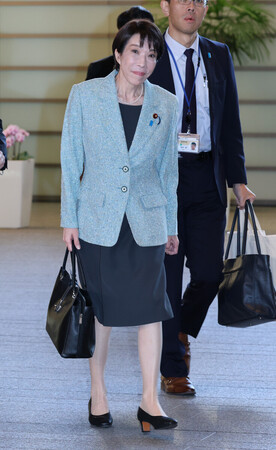 〔写真説明〕首相官邸に入る高市早苗首相=8日午前、東京・永田町