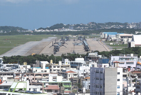 〔写真説明〕住宅密集地にある米軍普天間飛行場(中央)=2023年10月、沖縄県宜野湾市