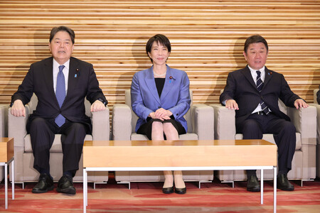 〔写真説明〕閣議に臨む高市早苗首相(中央)=23日午前、首相官邸