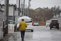 〔写真説明〕雨が降る中、仮設住宅の敷地内を歩く女性=12月24日、石川県輪島市