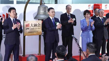 〔写真説明〕東証証の大納会で手締めをする日本取引所グループ(JPX)の山道裕己最高経営責任者(右端)、高市早苗首相(右から3人目)ら=2025年12月30日、東京都中央区