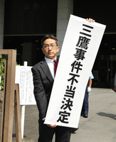 〔写真説明〕再審請求が棄却され、「三鷹事件不当決定」の垂れ幕を掲げる弁護士=2019年7月31日、東京都千代田区