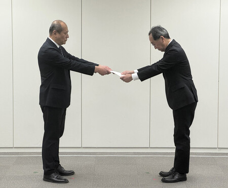 〔写真説明〕原子力規制庁の担当者(左)から報告徴収の命令書を受け取る中部電力の豊田哲也原子力本部長=14日午後、東京都港区
