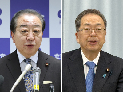 【時事通信社】 〔写真説明〕立憲民主党の野田佳彦代表(写真左)と公明党の斉藤鉄夫代表