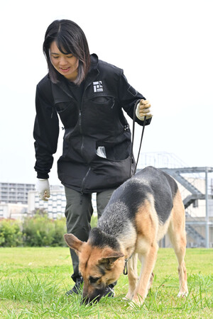 〔写真説明〕「足跡追及」訓練でにおいを嗅ぐジャーマンシェパード「モニ(フサフサ号)」とハンドラーで警視庁鑑識課警察犬係の立石彩水巡査長=2025年11月5日、東京都東大和市
