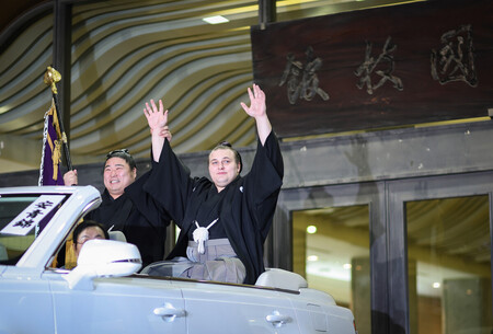 〔写真説明〕優勝パレードで声援に応える安青錦(右)=25日、東京・両国国技館
