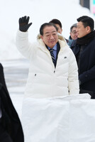 〔写真説明〕雪が積もった演説会場で手を振る中道改革連合の野田佳彦共同代表=27日午前、青森県弘前市