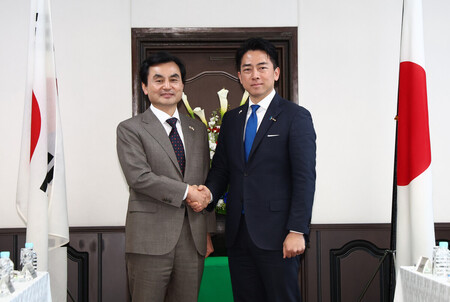 〔写真説明〕日韓防衛相会談に臨む小泉進次郎氏(左手前から2人目)と韓国の安圭伯氏(右手前から2人目)=30日午後、神奈川県横須賀市の海上自衛隊横須賀基地