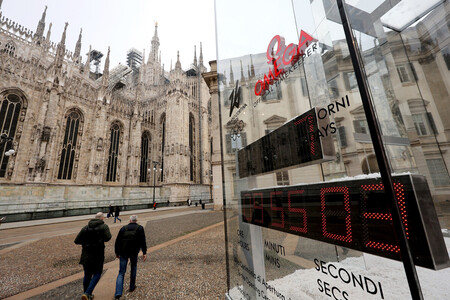 〔写真説明〕観光名所ドゥオーモの横に設置された、ミラノ・コルティナ冬季五輪開幕まで1週間を示すカウントダウンボード=30日、ミラノ