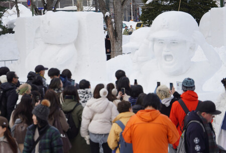 〔写真説明〕4日開幕した「さっぽろ雪まつり」で設置された米大リーグ大谷翔平選手らの雪像と観光客=同日午後、札幌市
